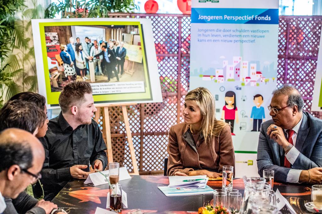 Koningin Máxima heeft donderdagochtend een werkbezoek gebracht aan Schuldenlab070 en het Jongerenperspectieffonds (JPF) in Den Haag.