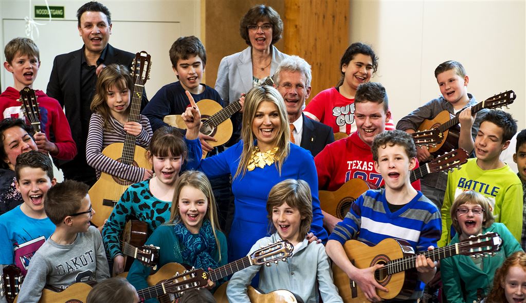 APELDOORN – Koningin Máxima heeft dinsdag in het Kristal in Apeldoorn muziek gemaakt met scholieren en ouderen. ‘Samen muziek maken’ was dan ook het thema van het werkbezoek waarbij Máxima tijdens de muziekuitvoering van de jongeren ook de trommel bediende en bij een intieme huiskamerontmoeting voluit meezong.