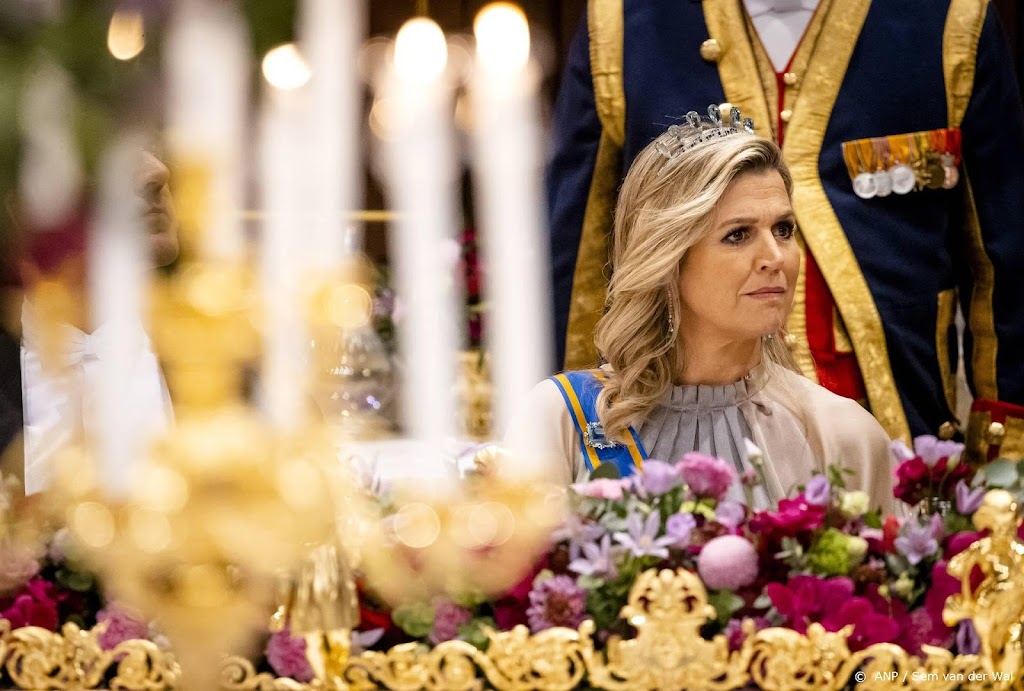 In 2018 droeg Máxima een bijpassende hoed. Dit keer draagt de koningin een diadeem met aquamarijnen.