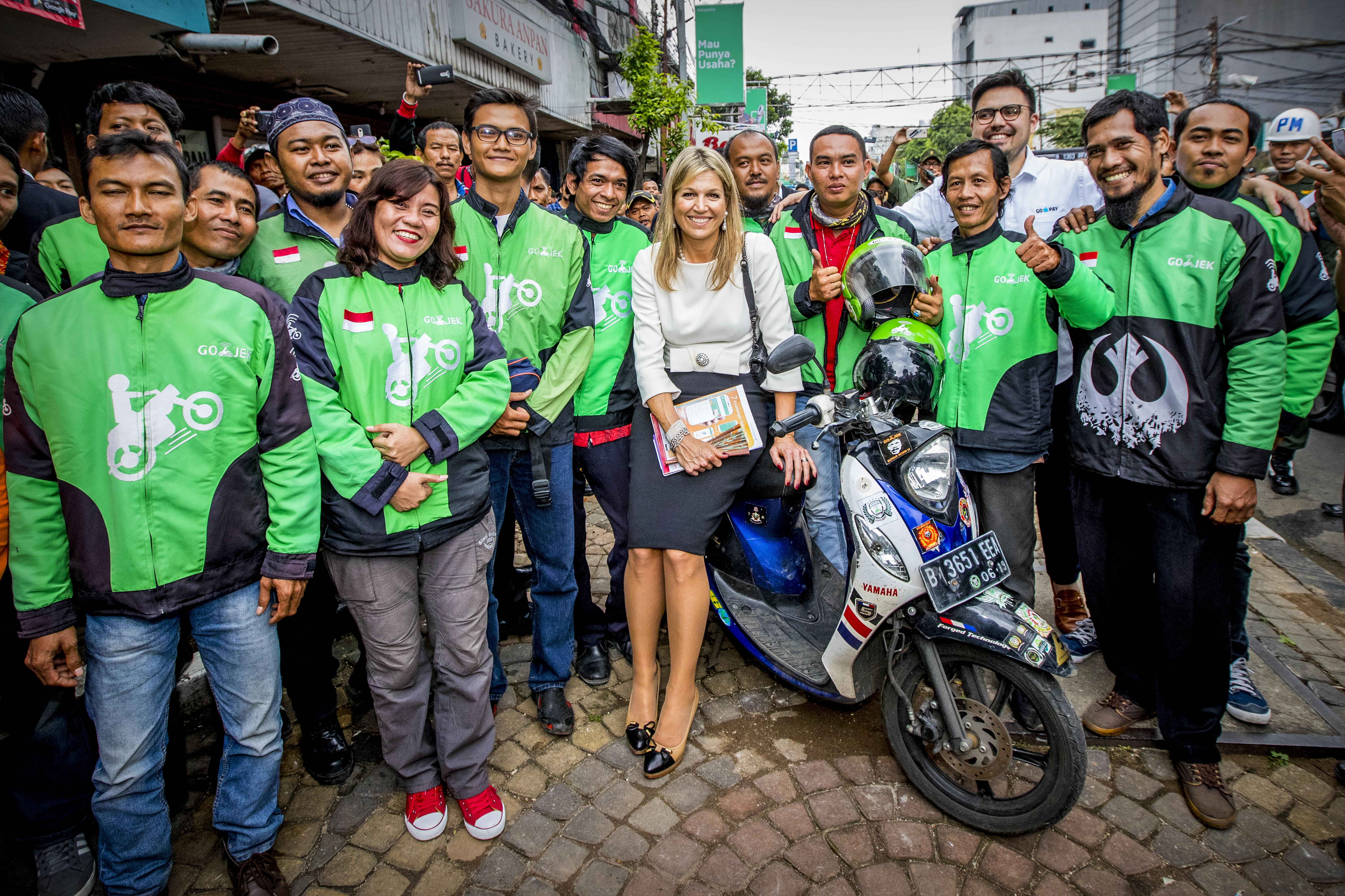 Koningin Máxima kan zo aan de slag voor Go-Jek, een Indonesisch bedrijfje dat via een app brommervervoer aanbiedt. In Jakarta poseerde Máxima dinsdag op de tweede dag van haar VN-werkbezoek aan Indonesië bij een klein restaurantje met de trotse rijders van Go-Jek, die ook worden ingezet door ondernemers van kleine bedrijfjes voor bijvoorbeeld maaltijd- of medicijnbezorging. Het restaurantje zette rijders in voor het bezorgen onder meer nasi.