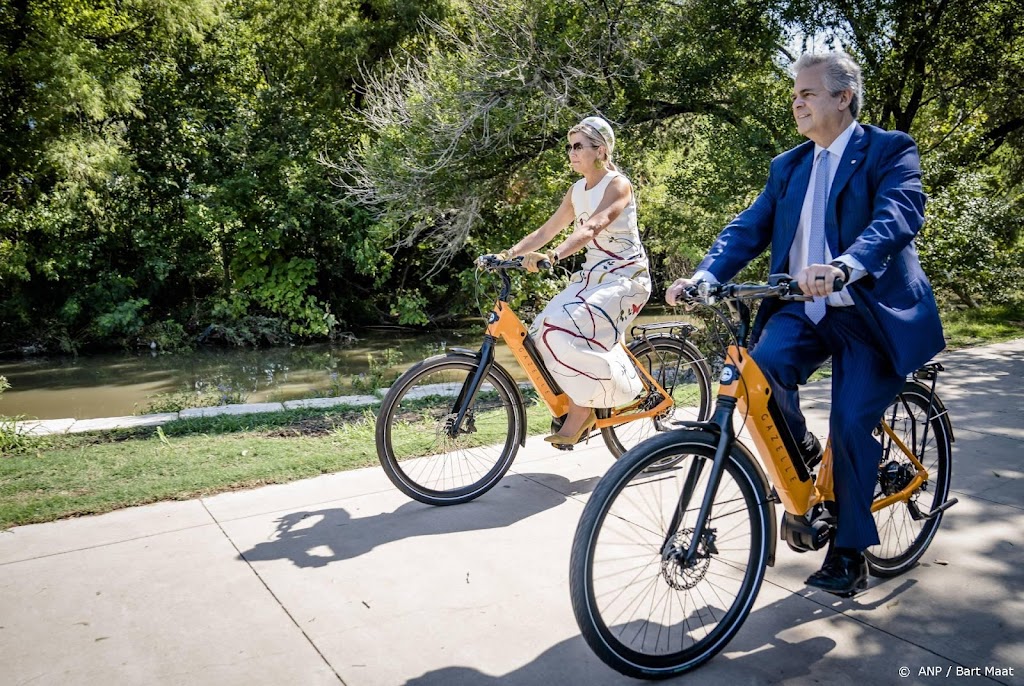 Bij een vochtige hitte van meer dan dertig graden maakte koningin Máxima een fietstochtje in de Texaanse stad Austin, samen met de burgemeester. De hoofdstad van de ‘Lone Star State’ loopt in de VS voorop als het gaat om fietsgebruik, aldus burgemeester Steve Adler.