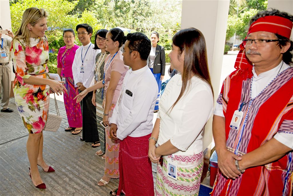 De eerste afspraak die de koningin in haar rol als VN-pleitbezorger had, was op het hoofdkantoor van de VN in Rangoon. Daar werd ze door Renata Lok-Dessallien van het ontwikkelingsprogramma van de VN bijgepraat over de staat van de financiële infrastructuur in het Zuidoost-Aziatische land.