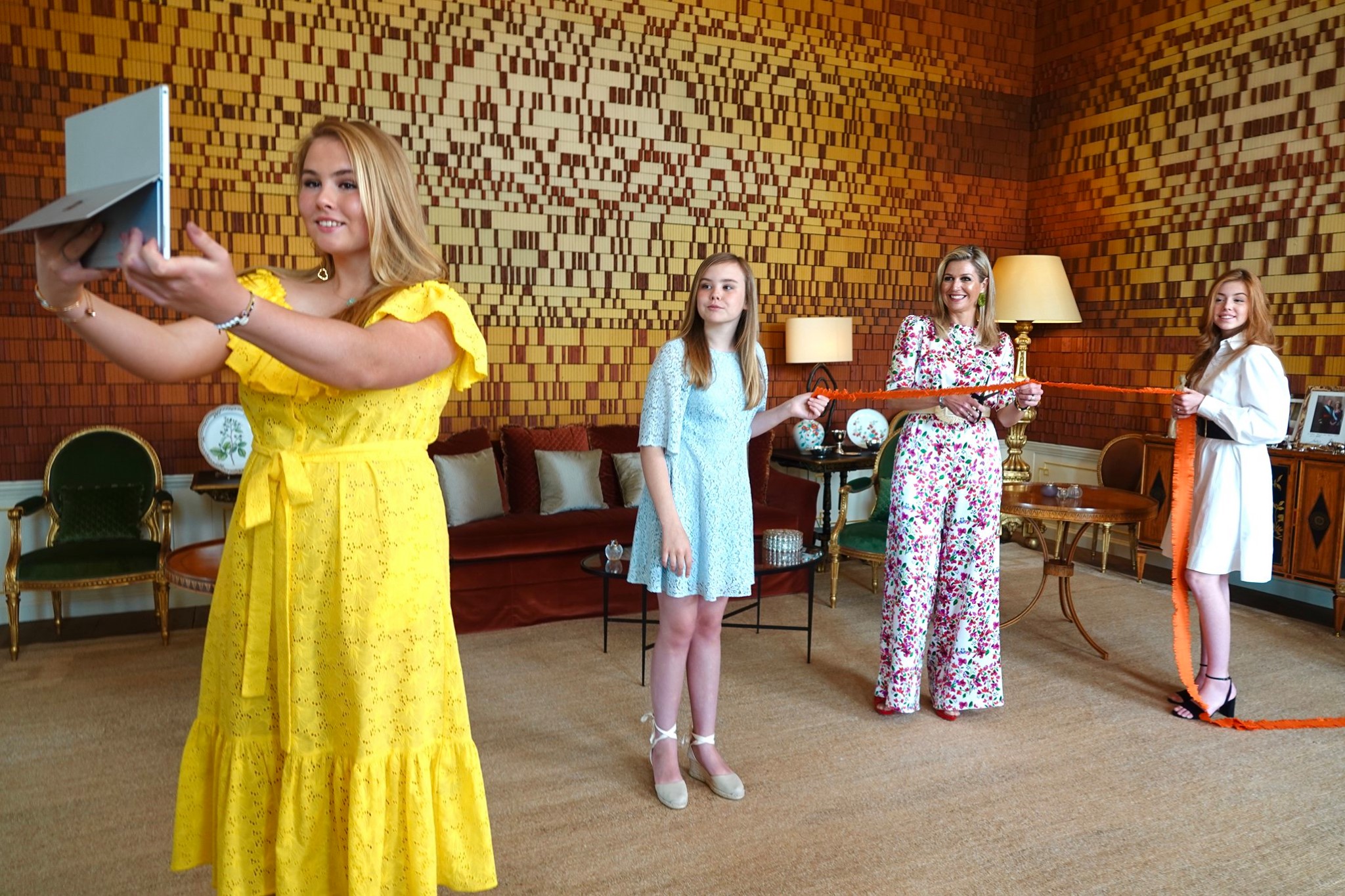 Op een foto die door het hof is verspreid is te zien dat Alexia en Ariane een oranje lint van crêpepapier vasthouden en dat Máxima klaarstaat om het lint door te knippen. Prinses Amalia staat even verderop om het tafereel met de tablet vast te leggen.