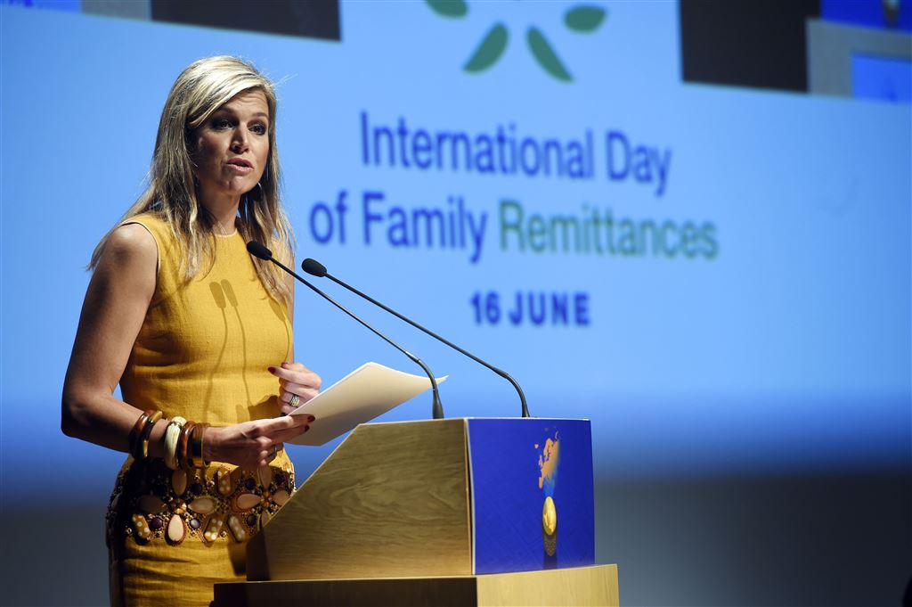 De koningin benadrukte in Italië het belang van veilige en betaalbare manieren om geld over te maken naar het thuisland. ”Drie maanden geleden was ik in Myanmar, een van de armste landen in Zuidoost-Azië, waar ze decennia van economische stagnatie proberen te overkomen. Miljoenen mensen uit Myanmar verdienen hun geld in Thailand, China of de VS. Ze vormen een levenslijn voor hun arme families thuis. En ze maken groei, ontwikkeling en financiële stabiliteit mogelijk in hun vaderland. De belangrijkste vraag met geldzendingen is dan ook: hoe kunnen we ervoor zorgen dat ze een zo groot mogelijke ontwikkelingsimpact hebben?”
