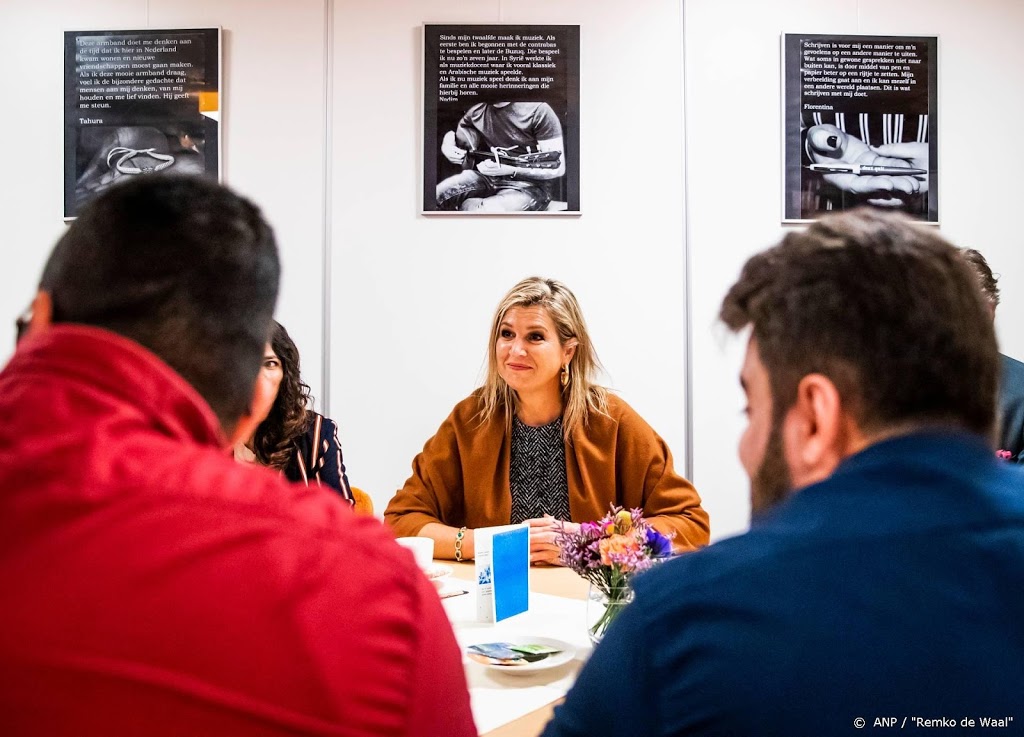 “Zullen we in het Engels spreken?”, stelde koningin Máxima woensdagmiddag voor tijdens haar bezoek aan ElanArt in de Hogeschool Arnhem en Nijmegen. Aan tafel jonge asielzoekers, nieuwkomers en vrijwilligers van de stichting die hen met kunst en cultuur op weg helpt in de Nederlandse samenleving.