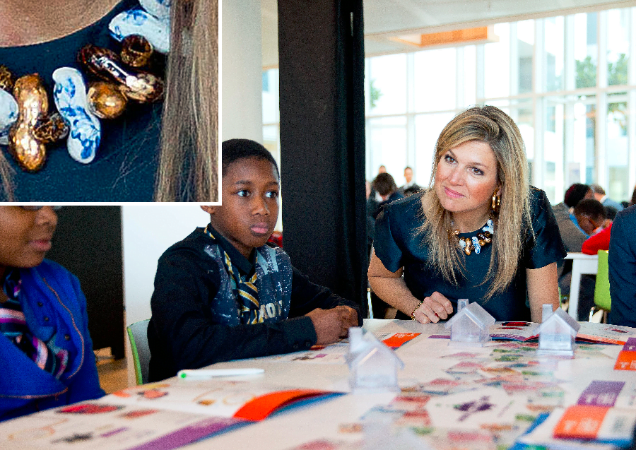 Koningin Máxima zorgde vanmorgen letterlijk en figuurlijk voor een vrolijke noot tijdens een geldles in Amsterdam. De koningin droeg bij haar top en broek van modehuis NATAN namelijk een opvallende ketting met versierde pelpinda’s. De Nederlandse Pauline Wiertz maakte het pindacollier, zoals ze het zelf omschrijft. Koningin Máxima draagt vaker dergelijke modesieraden, bijvoorbeeld van het Deense merk Monies. Op de redactie van Vorsten zijn we heel benieuwd wat u van Máxima’s keuze vindt. Mooi of niet?