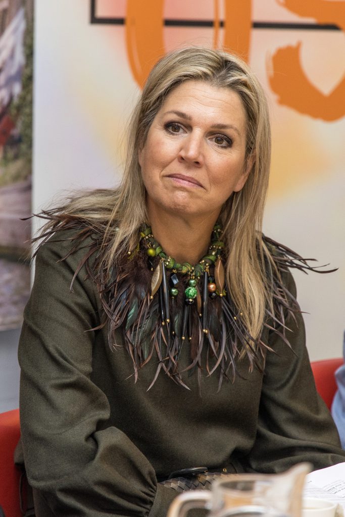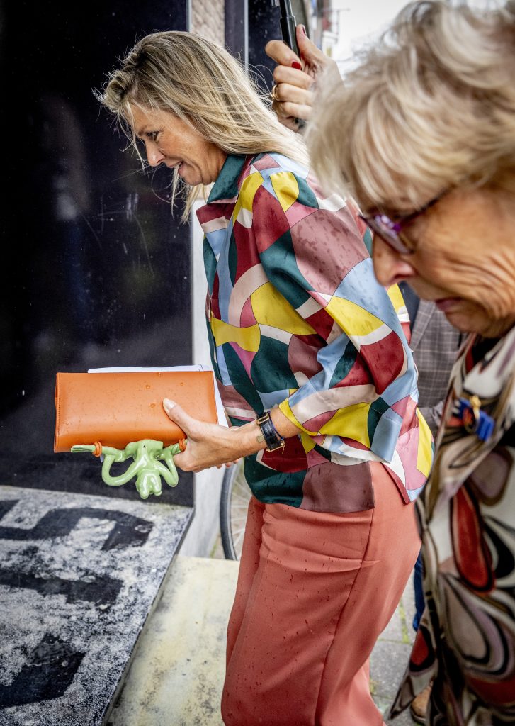Met wel een heel bijzonder accessoire bezocht Máxima stichiting MindUS. Op haar clutch zit een kikker in yoga-houding.