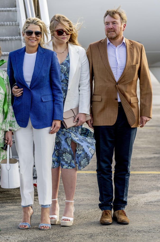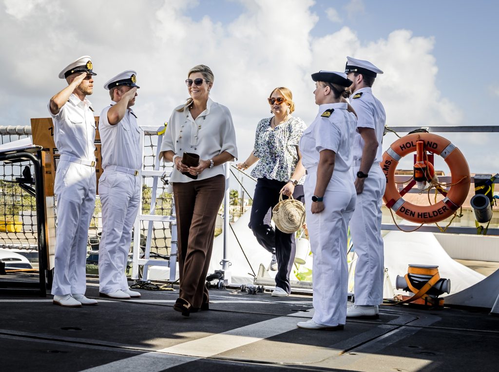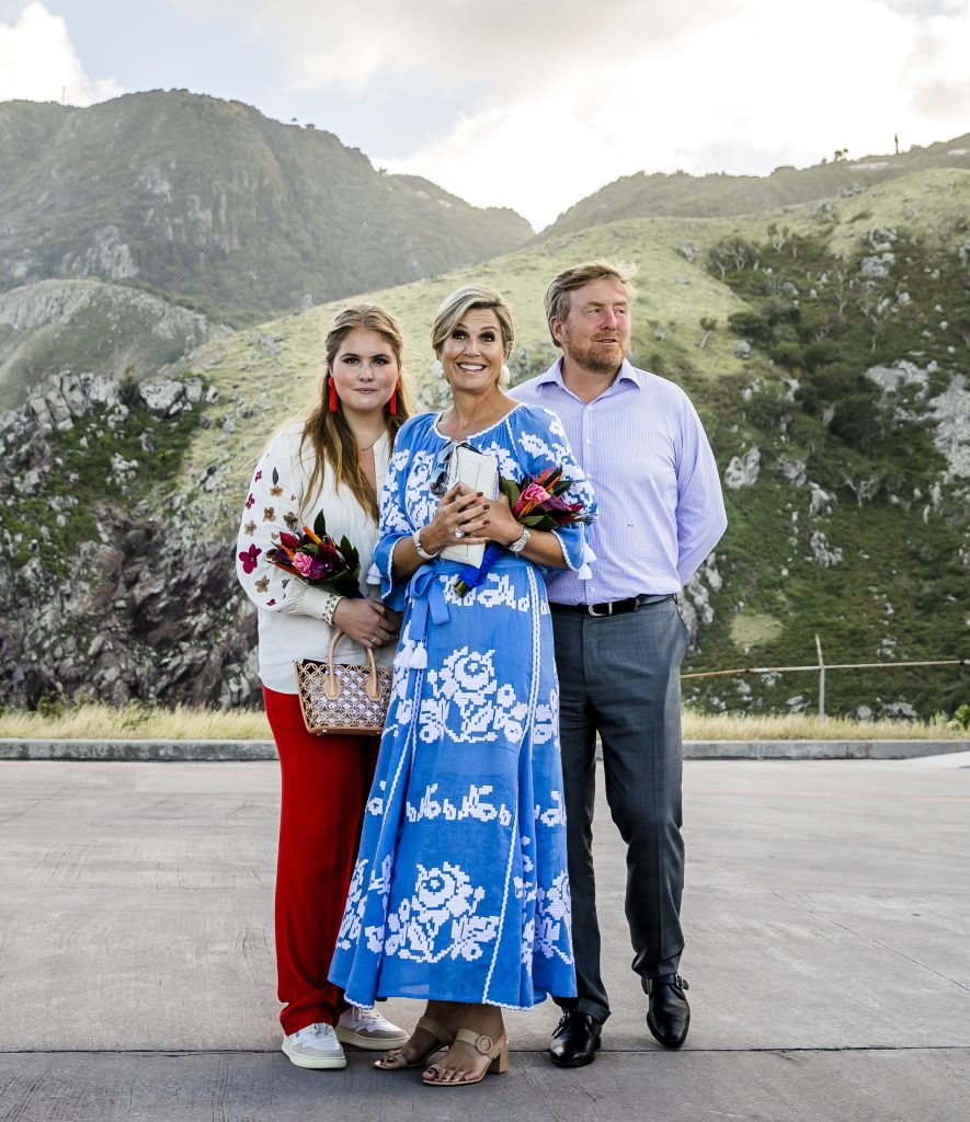 Op Bonaire stapt Máxima fris het vliegtuig uit in blauw en wit om aan de kennismakingstoer van prinses Amalia te beginnen.