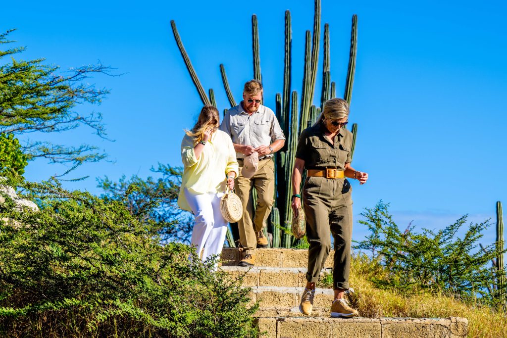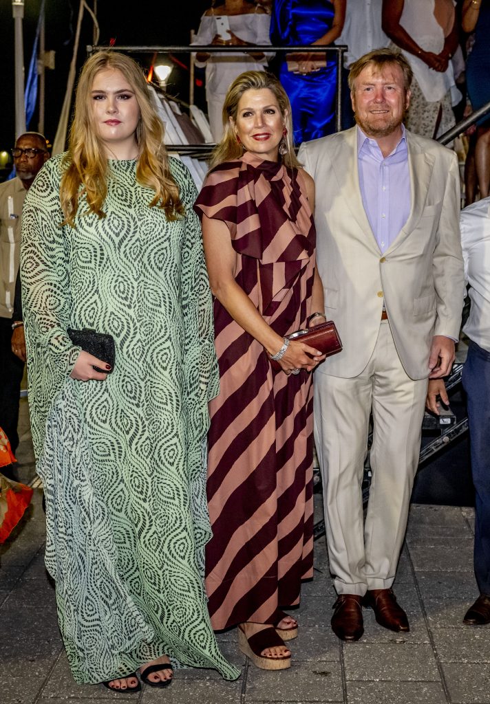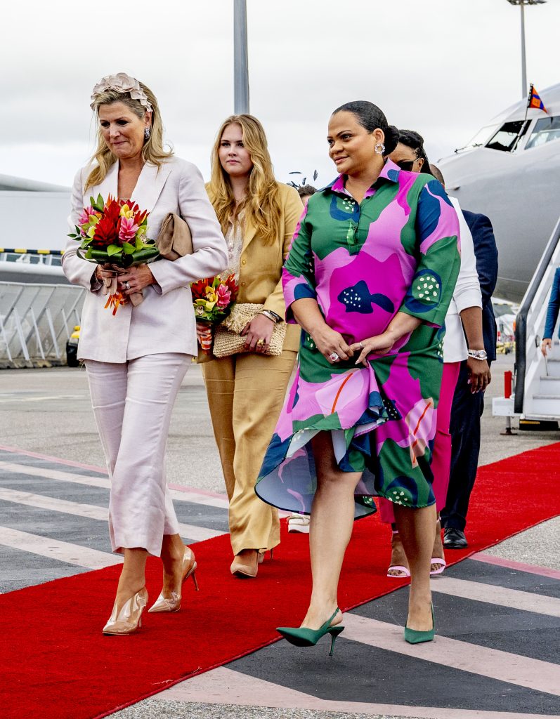 Máxima wordt met Amalia en Willem-Alexander officieel op Aruba ontvangen en daar hoort een op en top koninginnen-outfit bij.