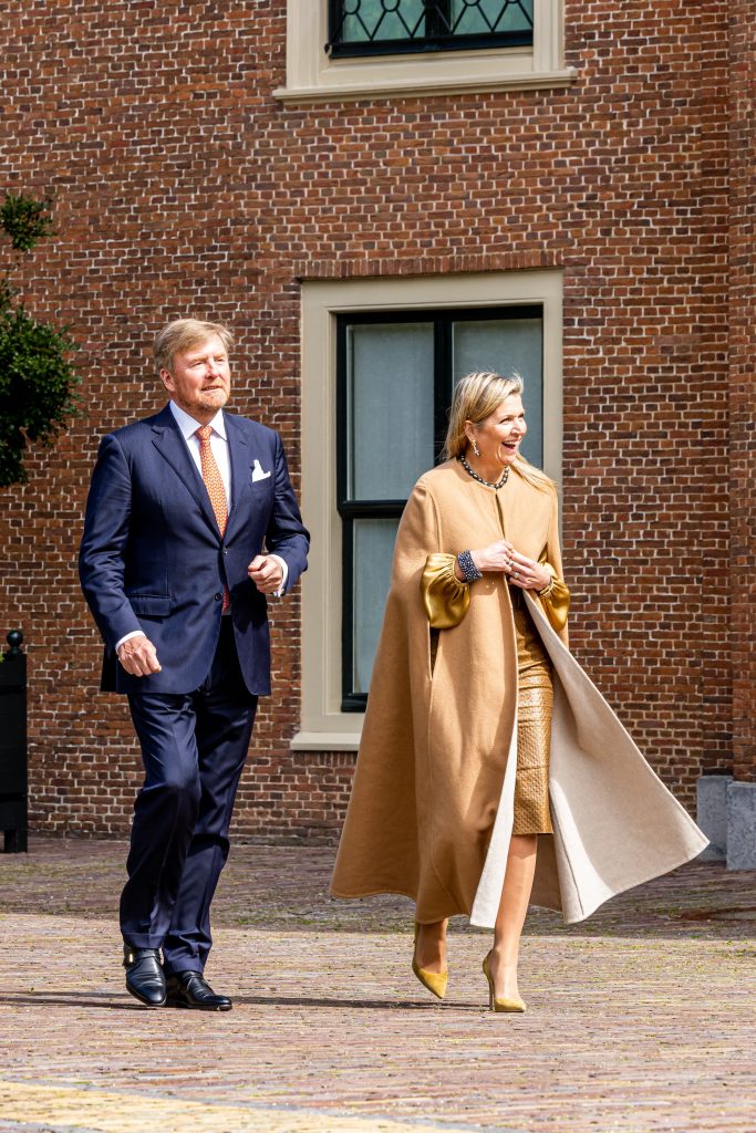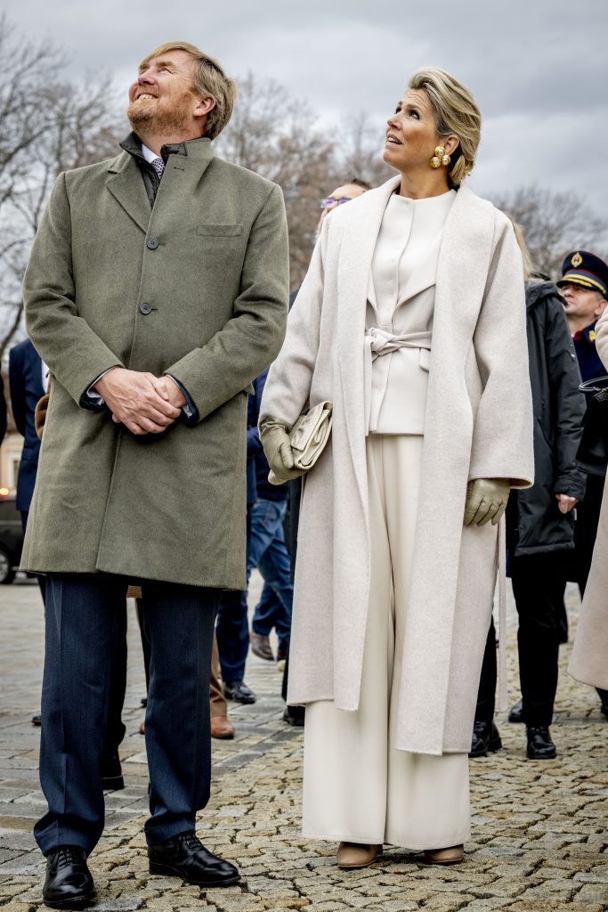 De mantel gaat vanwege het weer maar weinig uit tijdens het staatsbezoek aan Slowakije, eronder gaat een nieuw broekpak van Natan schuil.