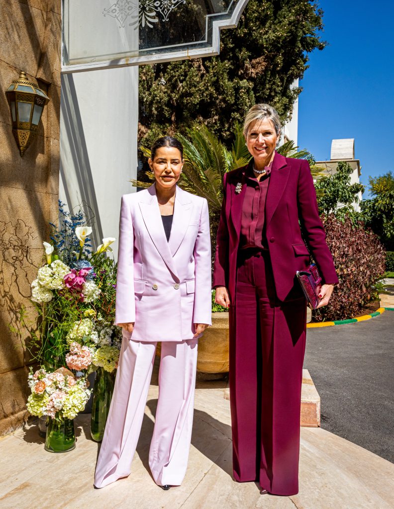 Tijdens dezelfde reis door Marokko gaat Máxima bij Marokkaanse prinses Lalla Meryem op de thee in een auberginekleurig broekpak van de Deens-Nederlandse ontwerper.