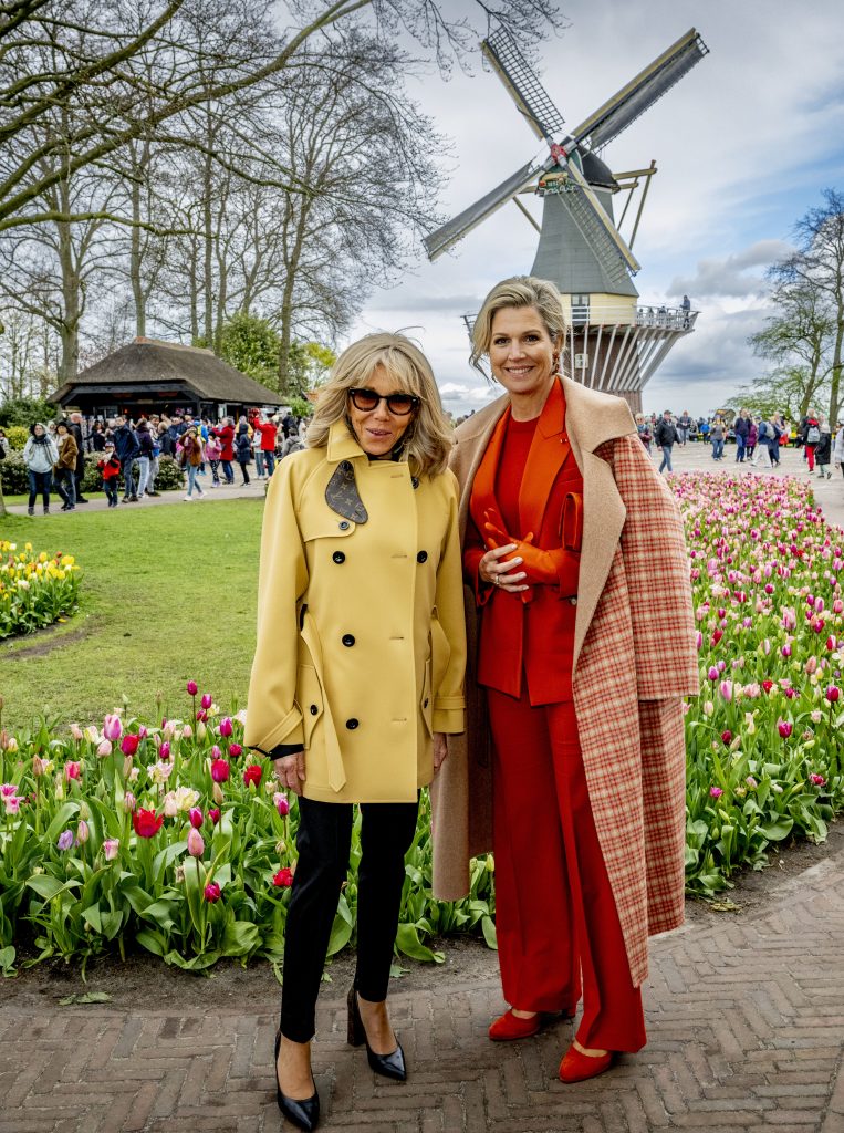 Twee merken die we niet zoveel bij Máxima zien. Een oranje broekpak en mantel met dito ruitje. Máxima debuteert de combinatie (het broekpak zagen we al een maandje eerder) tijdens het staatsbezoek van president Emmanuel Macron en zijn echtgenote Brigitte aan Nederland.