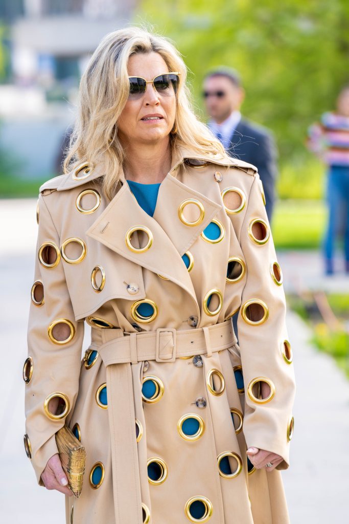 Een (regen)jas in deze prijscategorie die vrijwel alle praktische functie verliest door de gaten. Het is niet voor iedere sterveling weggelegd. Maar wat een statement maakt Máxima tijdens een bezoek aan de Salone del Mobile in Milaan, prachtig!