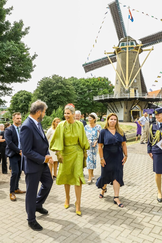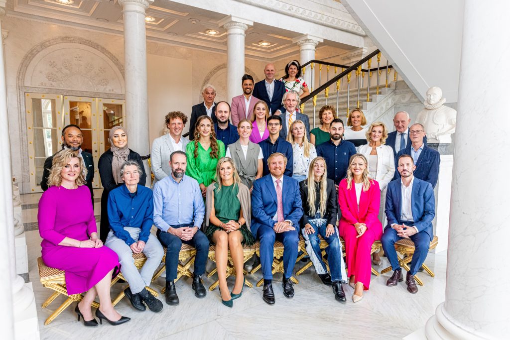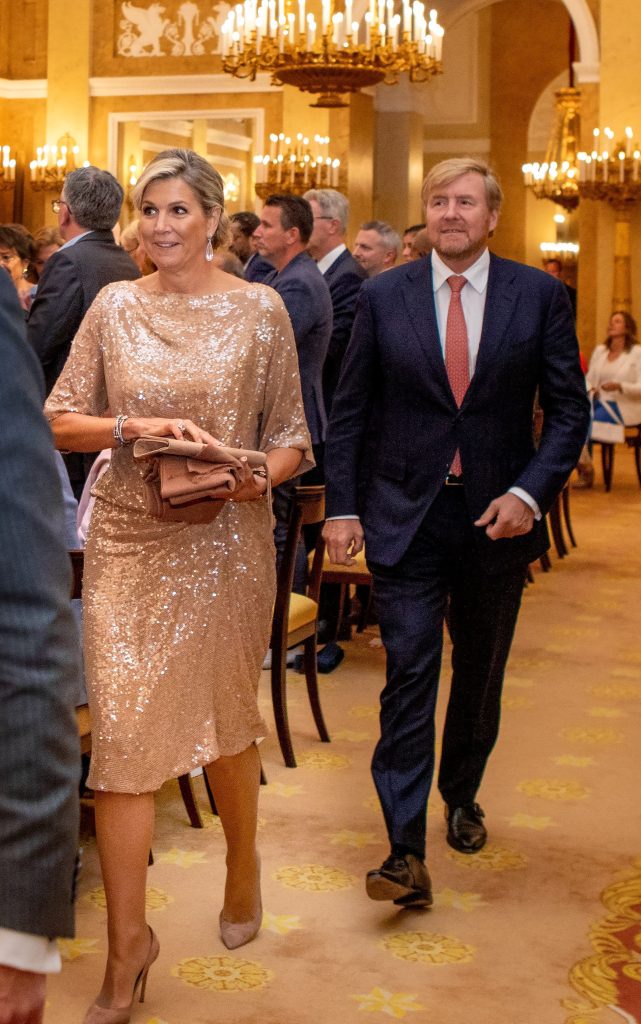 In een mouwloos jurkje met een bescheiden vestje ontvangt Máxima met Willem-Alexander de gasten voor de Uitblinkerslunch op Paleis Noordeinde.