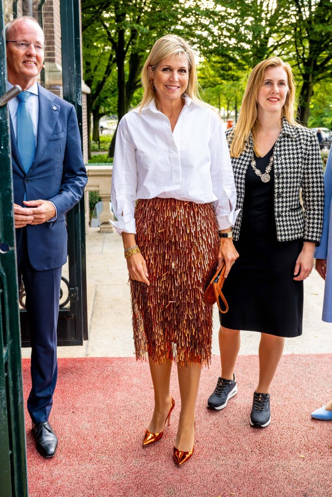 Op het eerste gezicht lijkt het een jurk, maar de outfit bestaat toch echt uit een rok en een top. Een methode die Máxima vaker toepast, zo creëert ze gecombineerd met andere stukken zo weer een nieuwe look.