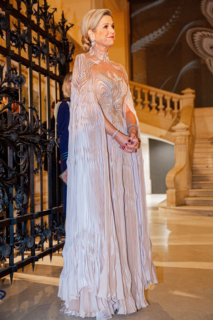 In Parijs is de koningin bij de opening van een tentoonstelling van de Nederlandse ontwerper Iris van Herpen. Uiteraard in een creatie van Van Herpen!