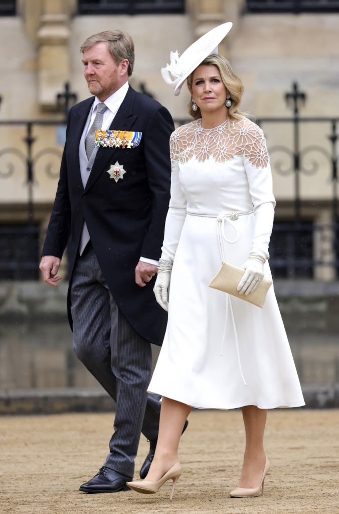 Tijdens de kroning van koning Charles op 6 mei verschijnt Máxima in een nieuwe witte jurk van Jan Taminiau.