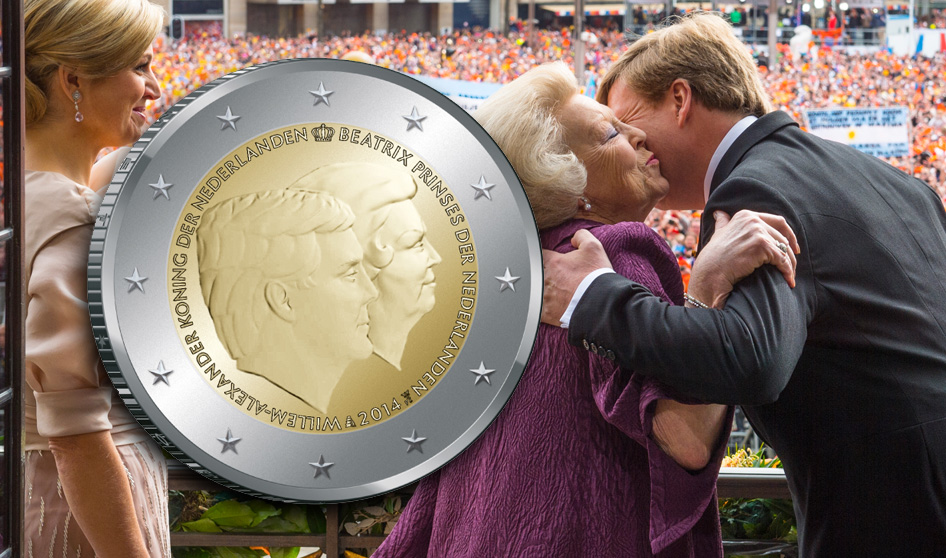 Op de Nederlandse zijde van de twee euromunt komt een dubbelportret, ter herinnering aan het afscheid van de voormalig vorstin. Een vergelijkbaar dubbelportret werd gemaakt vanwege de abdicatie van toenmalig koningin Beatrix. De munt heeft niet de datum van 30 april, maar is gedateerd op 28 januari 2013, de datum dat Beatrix in een televisieboodschap het besluit kenbaar maakte om afstand te doen van de troon. Op die munt stond de koningin als gebruikelijk naar links kijkend, met de op dat moment nog Prins van Oranje achter haar. Op de munt die nog geslagen moet worden, staat de huidige koning voorop, kijkend naar rechts. De prinses staat achter hem afgebeeld, eveneens naar rechts kijkend.