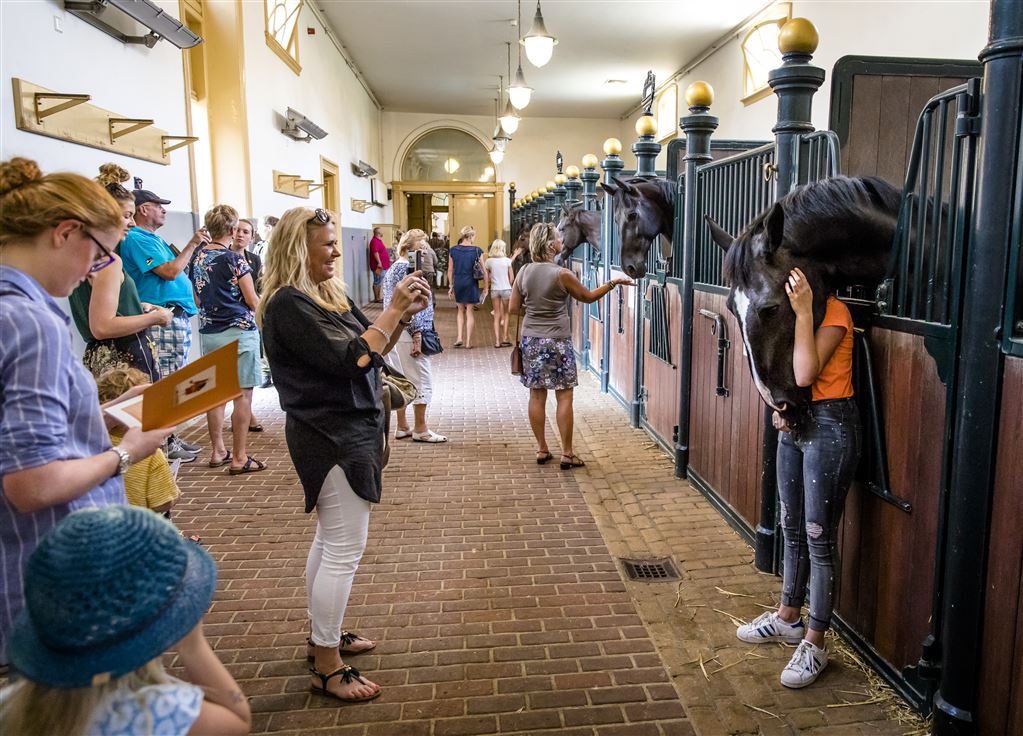 Ook veel van de koninklijke paarden waren op stap, zodat er in de Stallen op de eerste dag van de zomeropenstelling geïmproviseerd moest worden. De rijpaarden bijvoorbeeld hadden voor één keer in intrek genomen bij de thuis gebleven koetspaarden, die zich voor de gelegenheid uitgebreid lieten knuffelen.