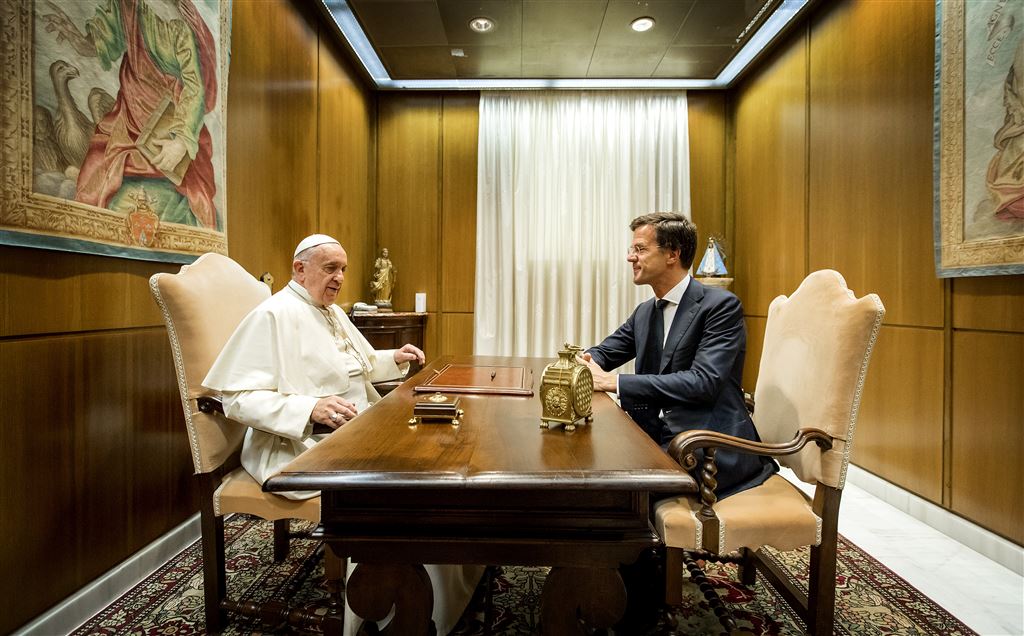 Rutte zou eigenlijk vorige maand al langsgaan bij de paus, maar dat treffen werd uitgesteld. In maart 2013 was hij samen met toenmalig prins Willem-Alexander en toen nog prinses Máxima bij de inhuldiging van Franciscus. Willem-Alexander en Máxima hadden eind april voor het eerst als koningspaar een ontmoeting met de paus. Ook de prinsesjes Amalia, Alexia en Ariane troffen Franciscus.