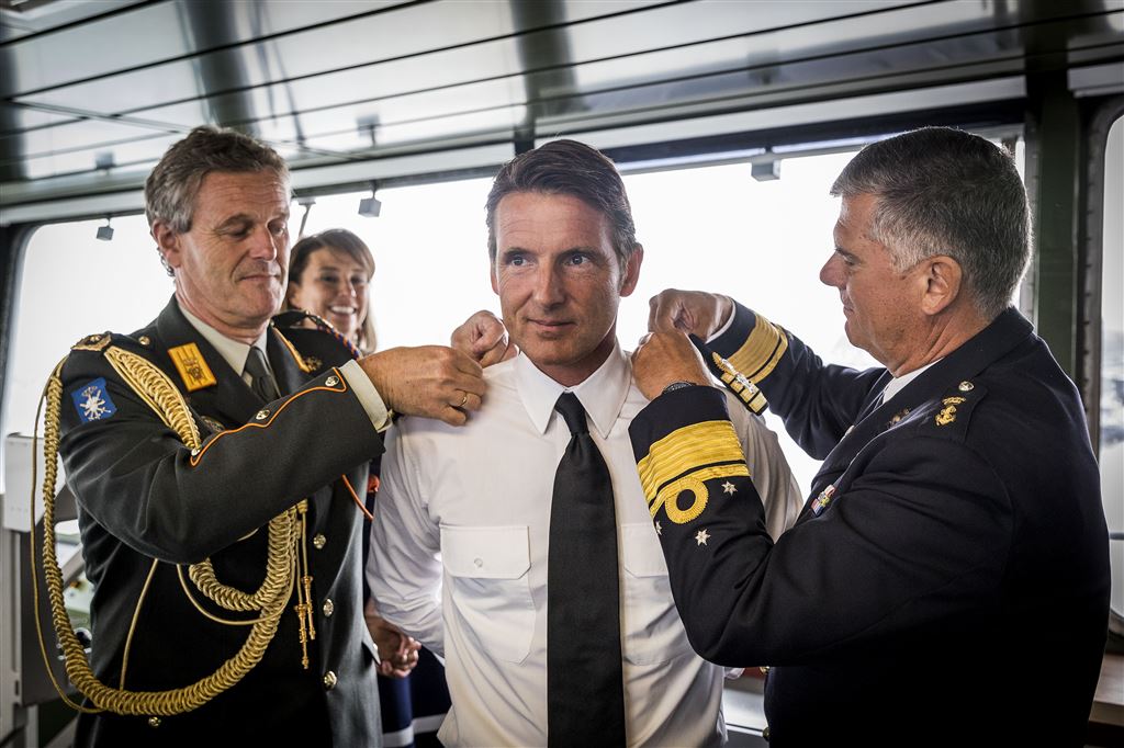 Generaal Rob Verkerk, Commandant der Zeestrijdkrachten, en generaal Hans van der Louw, chef van het Militaire Huis van de Koning, mochten de nieuwe rangonderscheidingstekens op de schouders van de prins bevestigen. Maurits was sinds mei 2013 kapitein-luitenant ter zee.