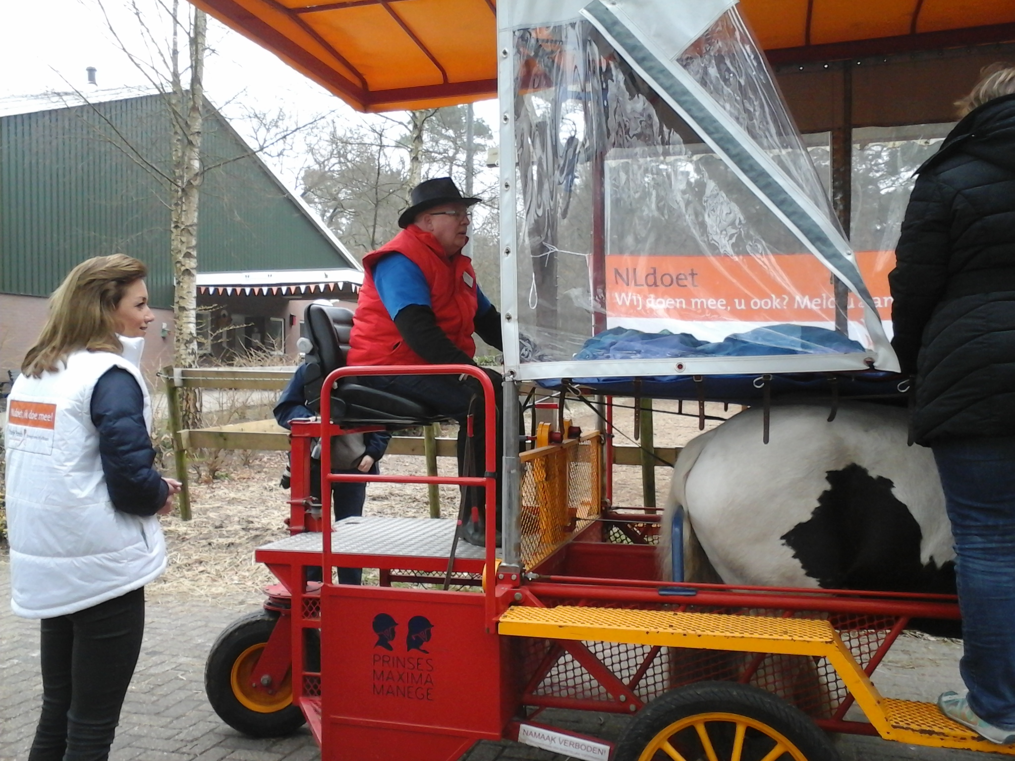 Schilderwerk werd gedaan door Beatrix en Aimée. Ze verfden een opstapperron, een houten constructie om makkelijker op een paard te klimmen. Ondertussen werkten Constantijn en Floris in het bos door takken te snoeien. Aimée nam ook de tijd om mee te rijden met een huifbed voor kinderen. De manege geeft paardrijlessen, fysiotherapie en logopedie te paard aan mensen met een beperking.