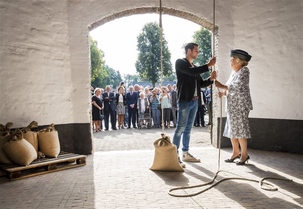 Prinses Beatrix heeft woensdag de gerestaureerde Molen De Hoop in Oldebroek geopend. Dat deed ze door een zak tarwe omhoog te hijsen.