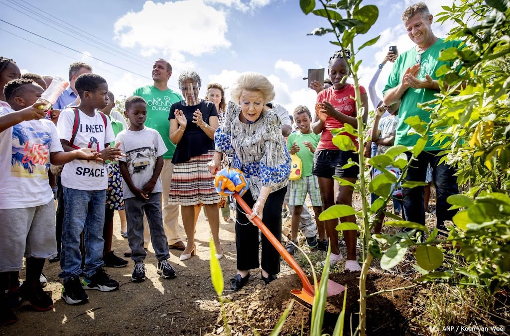 Prinses Beatrix werd zaterdag flink aan het werk gezet toen ze een bezoek bracht aan een voedselbos in Willemstad tijdens haar werkbezoek aan Curaçao. De 83-jarige prinses kreeg een oranje schep in haar handen waarmee ze een sinaasappelboom mocht planten. Eigenlijk hoefde ze maar een klein schepje te doen, maar Beatrix had de smaak goed te pakken en schepte fanatiek haar boom de grond in.