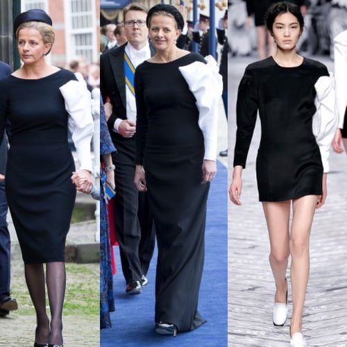 Voor de herdenkingsdienst in de Oude Kerk in Delft koos prinses Mabel een bijzondere zwarte jurk met witte mouw van Viktor en Rolf. Een bekende creatie, want de lange versie van de jurk zagen we eerder tijdens de inhuldiging van koning Willem-Alexander. De witte mouw met strik is een mooie verwijzing naar de lege plek waar Friso anders zou lopen en naar haar trouwjapon, die ze ruim negen jaar geleden droeg in deze zelfde kerk in Delft. Voor de hoed ging ze langs bij schoonzus Máxima, die ook voor de inhuldiging een hoofddeksel uitleende aan Mabel.