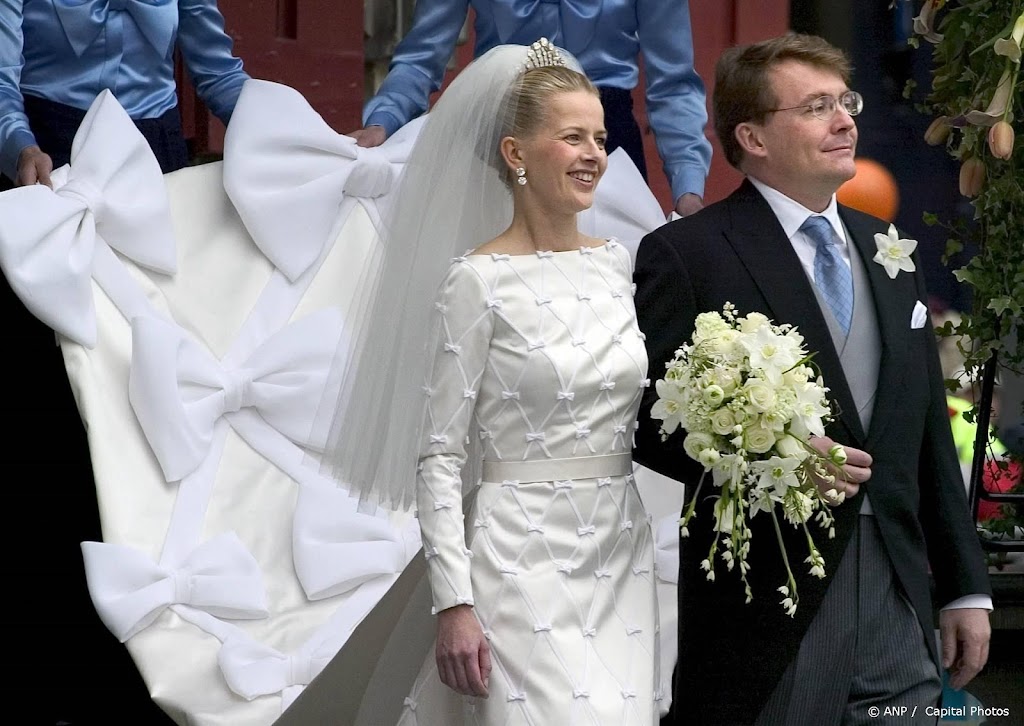 De satijnen japon wordt gekenmerkt door tientallen strikken. De prinses droeg de jurk toen ze in april 2004 trouwde met prins Friso in de Oude Kerk in Delft.