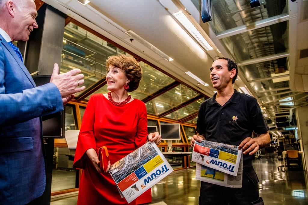 De prinses kreeg zaterdag het eerste exemplaar van het boek ‘Trouw – 75 jaar tegen de stroom in’, geschreven door historicus Peter Bootsma. Daarna kreeg Margriet een korte rondleiding door de drukkerij in gezelschap van hoofdredacteur Cees van der Laan en directeur Ruud de Klerk van de Persgroep.