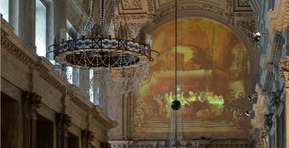Het paleis lost de verkleining op door een projectie van het werk van Van Rijn te laten zien, die door koning Willem-Alexander en zijn Zweedse collega wordt gestart. Dat gebeurt aanstaande vrijdag. Daarna is de projectie, die ook in 2011 te zien is geweest, de rest van april nog te bezichtigen.
