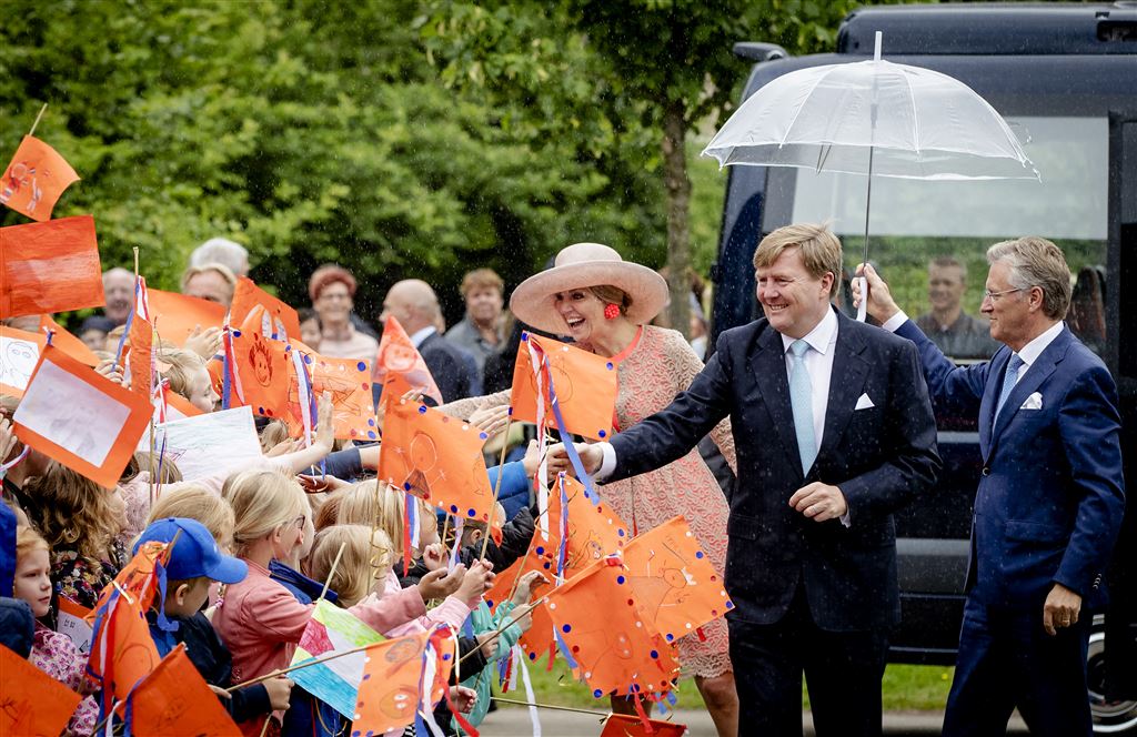 De plaatselijke schooljeugd moest enkele fikse regenbuien trotseren om het koninklijk bezoek te zien, maar het wachtten in de regen werd uiteindelijk beloond. Bij vertrek van het paar was het even droog en door de erehaag van kinderen deelde Willem-Alexander royaal ‘high fives’ uit, daarmee zichzelf ook een weg banend.