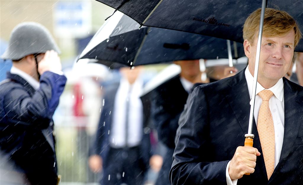 Regen en storm teisterden Noordwijk toen hij samen met Engelandvaarder Eddie Jonker in de duinen het splinternieuwe Museum Engelandvaarders opende. De paraplu’s boden geen bescherming tegen de elementen en Willem-Alexander probeerde de hoogbejaarde Jonker uit de wind te houden. Even later poseerden ze gezamenlijk bij de replica van het wankele scheepje waarmee Jonker destijds de Noordzee overstak.