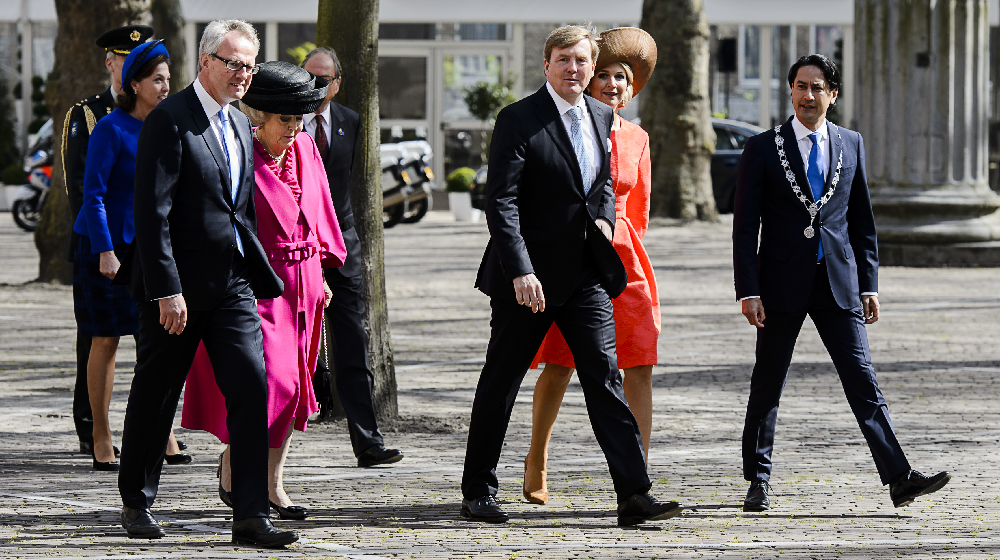 2016-04-21 00:00:00 MIDDELBURG - Prinses Beatrix, koning Willem-Alexander, koningin Maxima en burgemeester Harald Bergmann arriveren voorafgaand aan de uitreiking van de Four Freedoms Awards 2016 aan de Duitse bondskanselier Angela Merkel. ANP ROYAL IMAGES REMKO DE WAAL