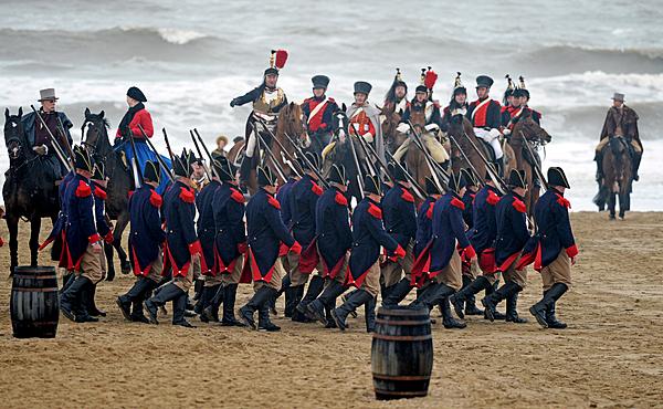 Precies tweehonderd jaar later speelt men de landing van prins Willem Frederik in Scheveningen na en het koningspaar is daarbij. ‘Bedankt voor de mooie ontvangst in Scheveningen’, zegt de koning tegen de tientallen in traditionele klederdracht geklede dames die klaarstaan waar de hofauto is gestopt. Terwijl van koningin Máxima’s kleding veel te raden overblijft dankzij de verhullende en warme mantel, moet het voor koning Willem-Alexander behoorlijk koud zijn. Hij heeft besloten geen jas te dragen, terwijl ze nog wel een hele poos op de tribune moeten zitten. Want daar aan het strand zullen ze het spektakel volgen.
