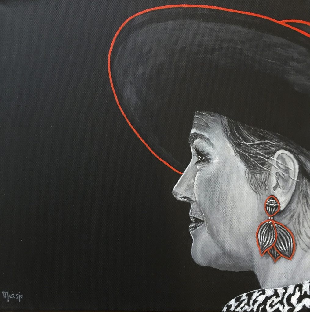 Metsje de Jong schilderde een portret van koningin Máxima met acrylverf, vanuit een origineel perspectief. De jury over het winnende schilderij: ‘Een schitterend portret van Máxima. Een zeer herkenbaar portret van de koningin in een zeer eigenzinnige perspectief, versterkt door de bijzonder lay-out in het vierkante vlak. Door alleen de hoedrand en oorbellen een bescheiden kleuraccent te geven in een verder volledig zwart/wit werk, wordt het modieuze profiel en elegantie van haar op een zeer verfijnde en toch krachtige manier benadrukt. Tenslotte is het subtiele portret zelf met de karakteristieke glimlach in olieverf zeer overtuigend uitgevoerd. Kortom; een terechte winnaar!’
