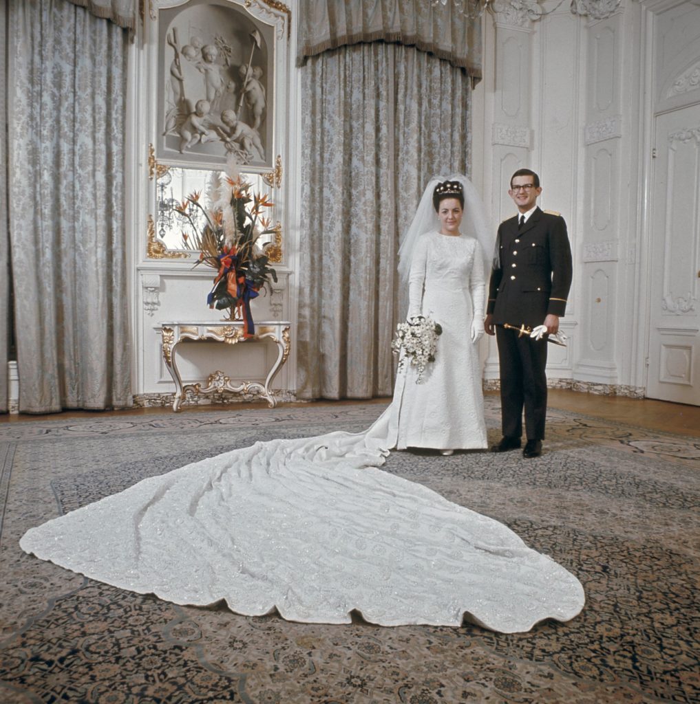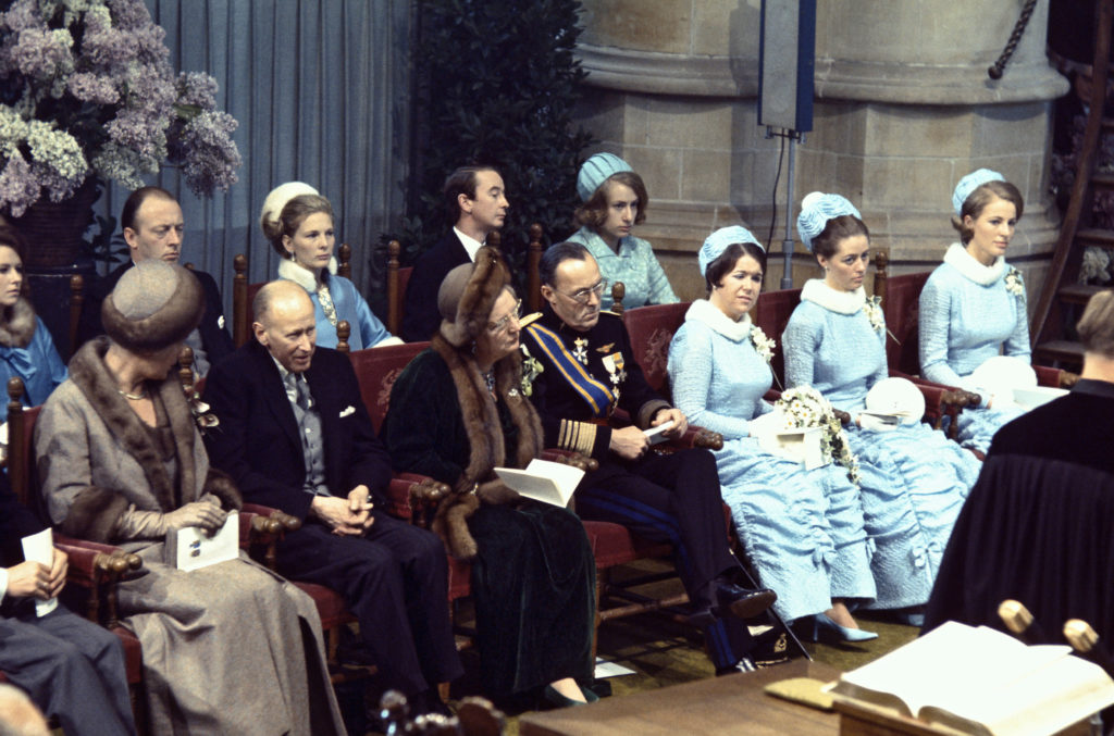 Margriet, niet vies van een beetje symboliek, draagt een diadeem met daarop parelmotieven die lijken op margrietjes, en op haar jurk zijn meer dan achthonderd margrietjes van pareltjes, stras en pailletten geborduurd. De koude winterdag biedt koningin Juliana de gelegenheid om met een warme bontmuts en bontkraag te verschijnen, prinses Irene beschermt haar oren tegen de kou met een ontwerp dat het midden houdt tussen een hoed en een muts die onder de kin is vastgeknoopt. De bruidsmeisjes verstoppen hun handen − als ze de sleep van Margriet hebben gedrapeerd − in mofjes, en hun jurken zijn afgewerkt met een randje wit bont langs de halslijn.