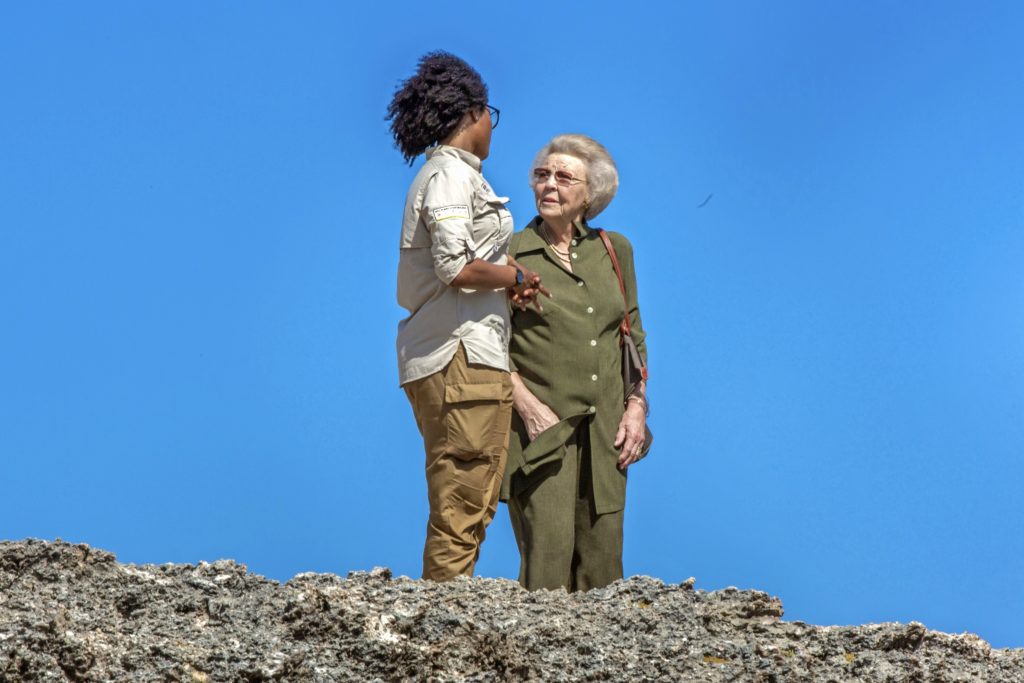 Een stralende Beatrix op Klein Bonaire, een eilandje voor de kust van Bonaire, waar ze twee schildpadden uitzet die ze vernoemt naar kleindochters Eloise en Zaria.
