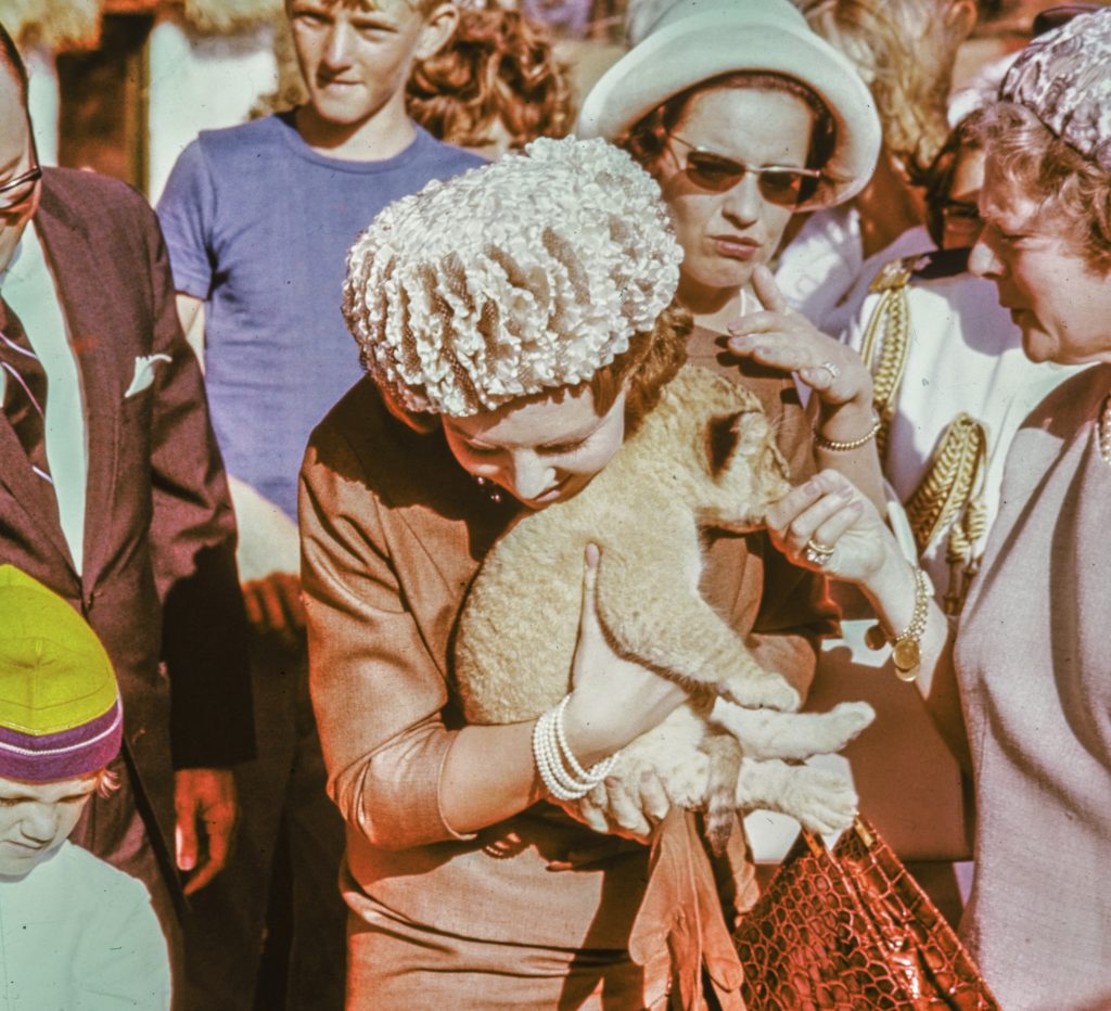 Beatrix knuffelt met een leeuwenwelpje tijdens een bezoek aan proeftuin Cas Corá op Curaçao. In haar eentje bezoekt ze de (dan nog) Nederlandse Antillen, een jaar later is ze er weer, nu om echtgenoot Claus voor te stellen met wie ze in 1966 trouwt.