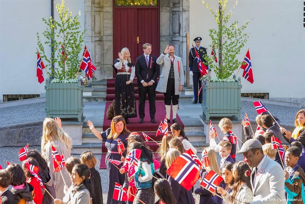 Het gezin van de Noorse kroonprins Haakon is woensdagochtend begonnen met de viering van de nationale feestdag. Samen met zijn vrouw Mette-Marit en hun zoon Sverre Magnus zwaaide Haakon naar de passerende kinderoptocht in Skaugum, waar de familie woont.