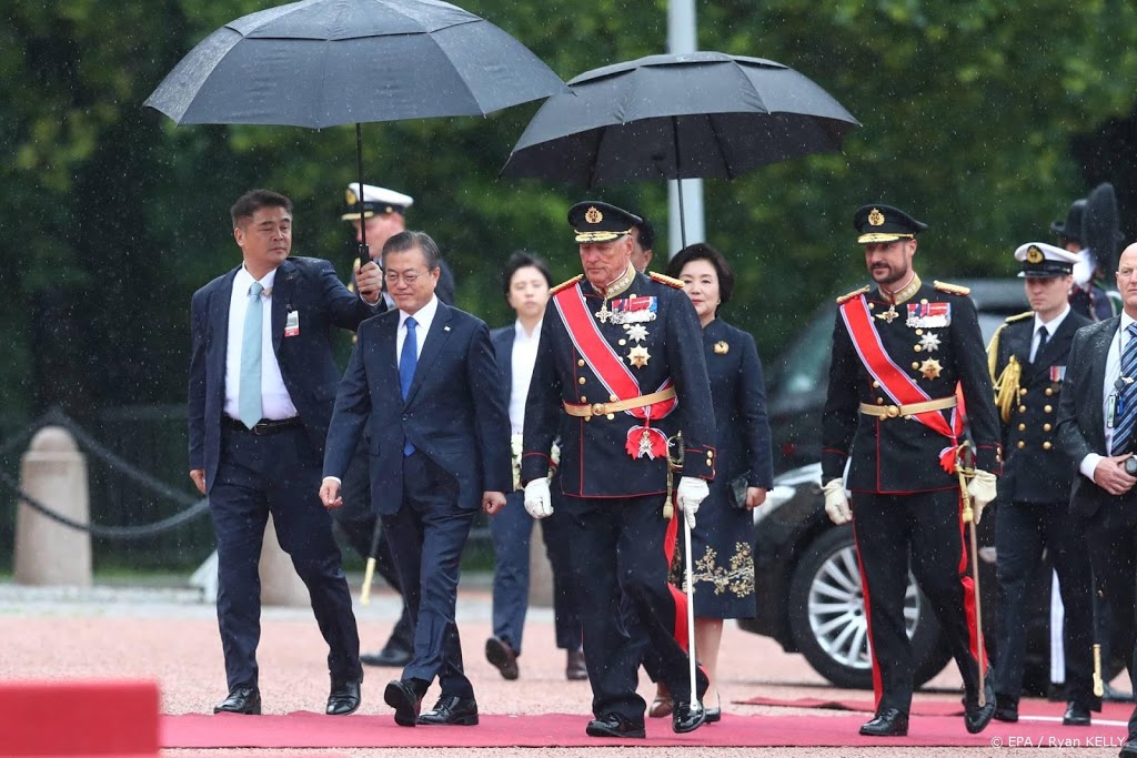 Echt mooi weer had Moon Jae-in niet meegenomen. Het regende tijdens zijn aankomst waardoor er assistenten met paraplu’s meeliepen om hem en zijn vrouw Kim Jung-sook droog te houden. Tot donderdag hoeft Moon Jae-in zich niet te vervelen. Zo legt de president later woensdag een krans bij het oorlogsmonument in de vesting Akershus en staan er ’s avonds een concert en galadiner gepland.