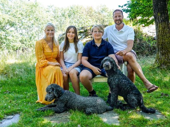 Mette-Marit en Haakon met Ingrid Alexandra, Sverre Magnus en honden Milly Kakao en Muffins Krakebolle in de zomer van 2020.