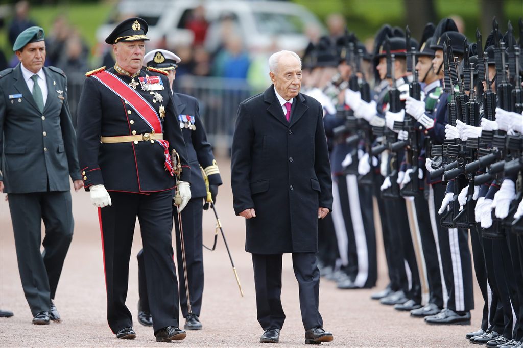 OSLO – De Noorse koning Harald heeft maandagmorgen de Israëlische president Shimon Peres met militair ceremonieel verwelkomd voor het Koninklijk Paleis in Oslo aan het begin van diens staatsbezoek aan Noorwegen. Ook koningin Sonja en kroonprinses Mette-Marit waren bij de begroeting aanwezig.
