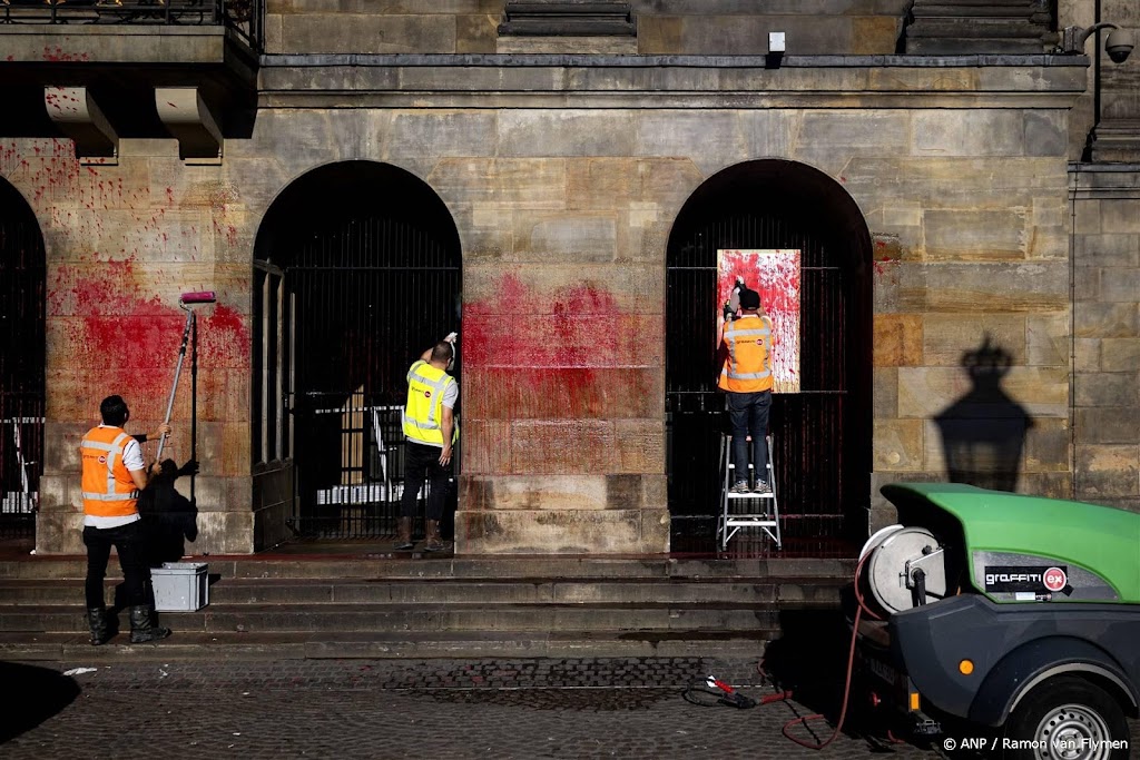 Het Paleis op de Dam in Amsterdam is in de nacht van zondag op maandag beklad met rode verf door een groep pro-Palestijnse activisten. Aan de Damkant van het gebouw zitten grote rode vlekken en met gele verf is het woord ‘intifada’ geschreven.
