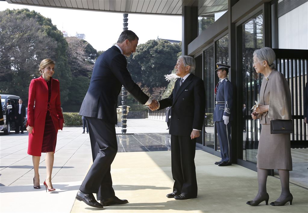 De Spaanse koning Felipe en zijn vrouw Letizia zijn woensdagochtend (lokale tijd) ontvangen op het keizerlijk paleis in Tokio. De Japanse keizer Akihito en zijn vrouw keizerin Michiko ontvingen het Spaanse koningspaar, dat deze week een staatsbezoek brengt aan het land van de rijzende zon.
