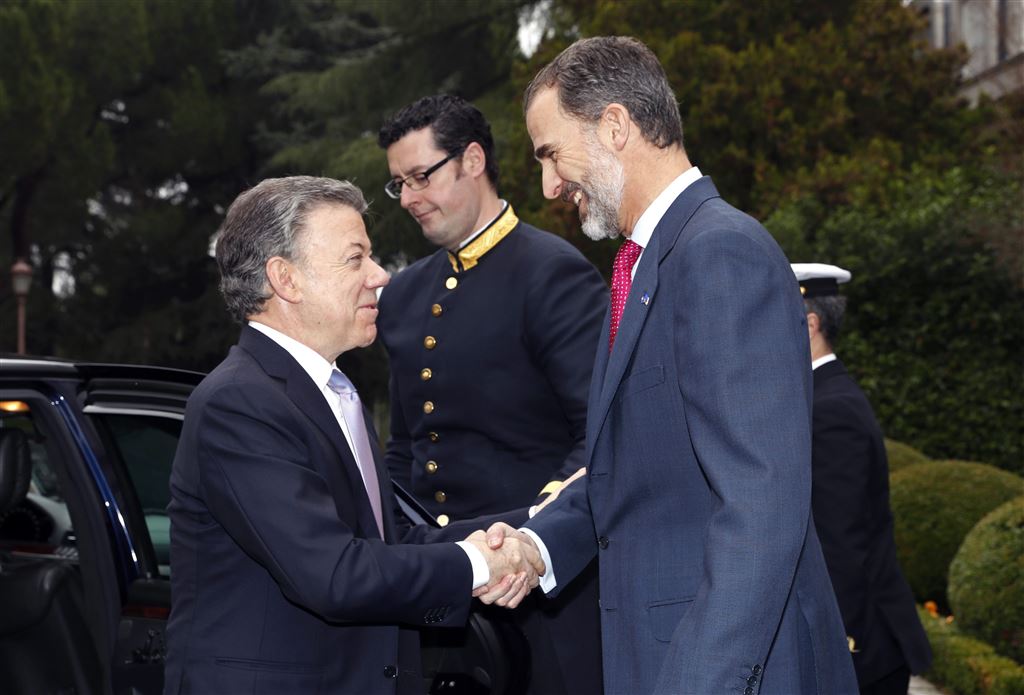 De Spaanse koning Felipe heeft dinsdag Juan Manuel Santos ontvangen. De Colombiaanse president, die afgelopen weekeinde werd onderscheiden met de Nobelprijs voor de Vrede, was uitgenodigd voor een privélunch in het Zarzuela Paleis in Madrid.