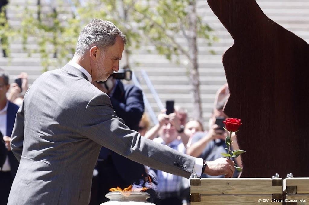 Koning Felipe heeft tijdens een herdenkingsbijeenkomst in Ermua een roos geplaatst bij een monument voor slachtoffers van terrorisme. Het is zondag 25 jaar geleden dat politicus Miguel Ángel Blanco door de Baskische terreurorganisatie ETA werd ontvoerd en vermoord.