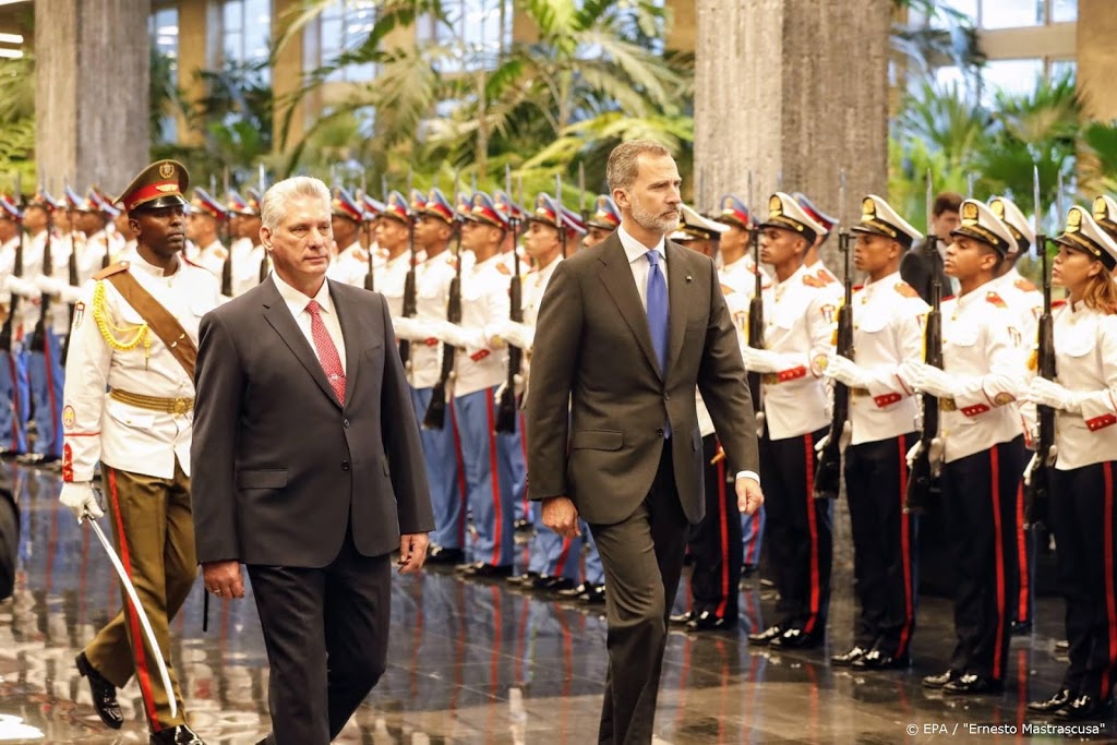 De Spaanse koning Felipe heeft dinsdag samen met de Cubaanse president Miguel Diaz een groet gebracht aan de militaire garde in het Paleis van de Revolutie in Havana. De ceremonie maakte onderdeel uit van het vierdaagse bezoek van de Spaanse vorst aan het communistische eiland.