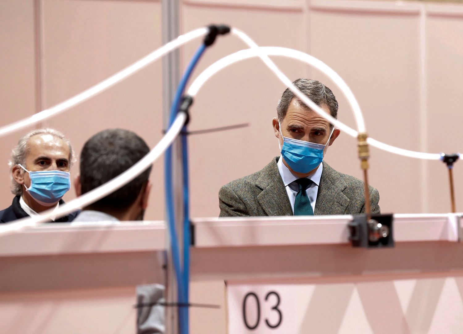 Evenementencomplex Ifema is deze week in razend tempo omgebouwd tot het grootste ziekenhuis van Spanje. Er is ruimte voor 5500 bedden. Voordat de eerste coronapatiënten er worden behandeld, nam Felipe een kijkje in het noodhospitaal. De koning, gewapend met een mondkapje en handschoenen, kreeg uitleg over de inrichting van het hospitaal en sprak enkele medewerkers.